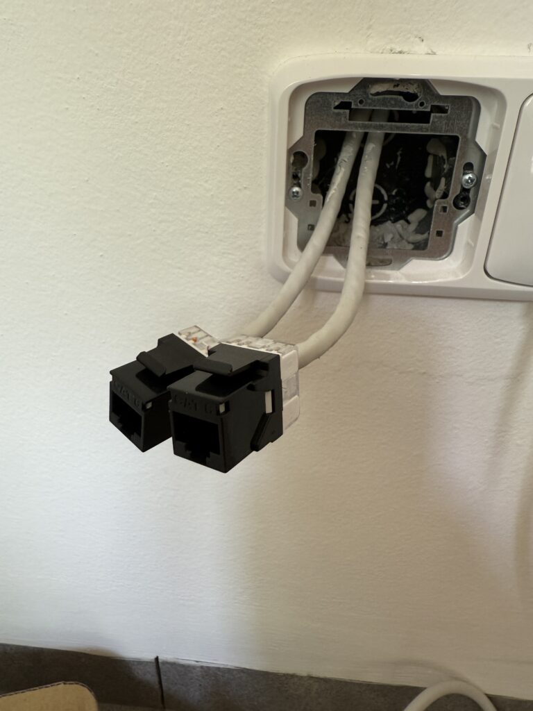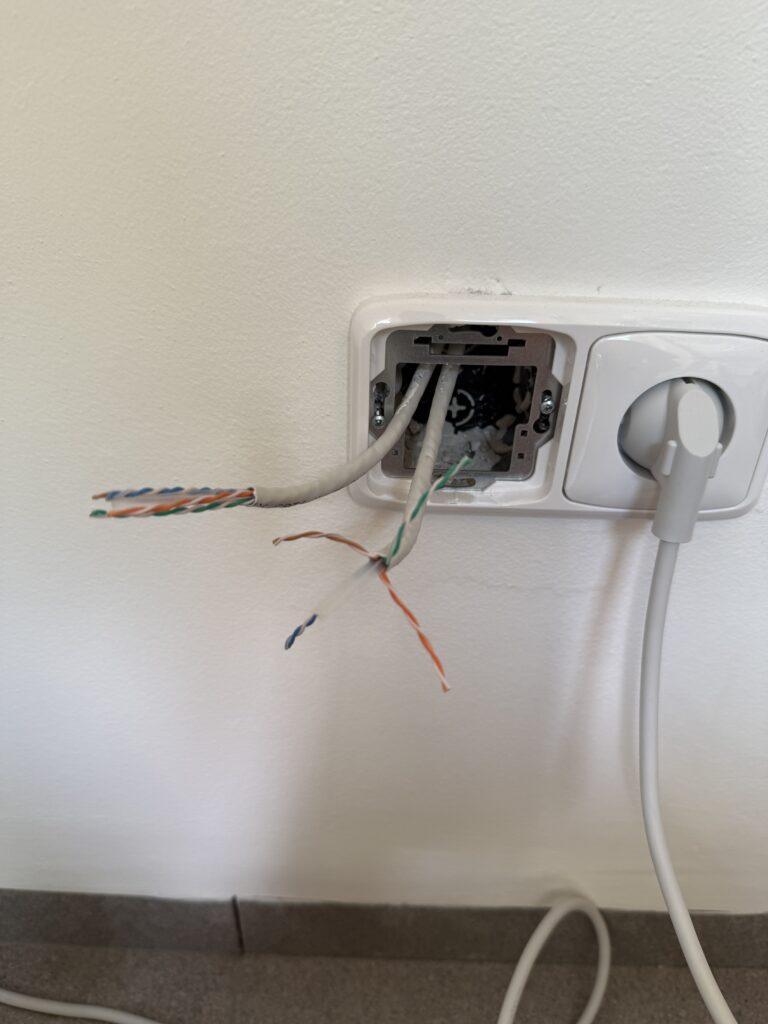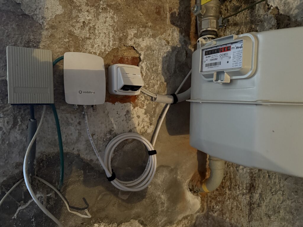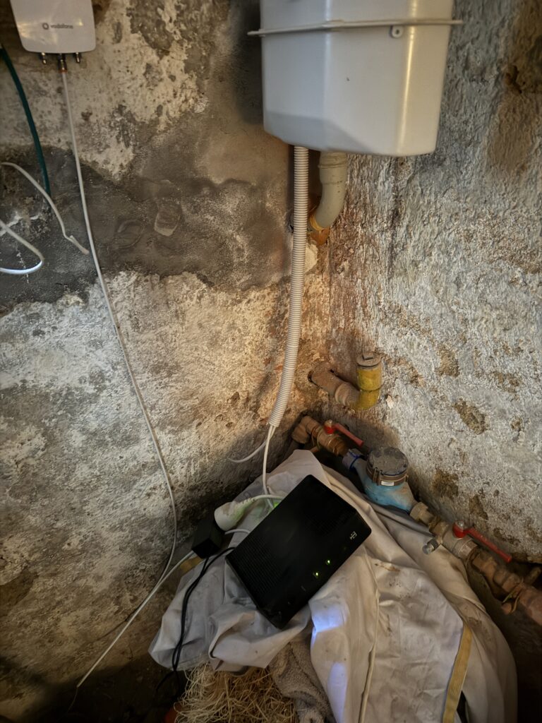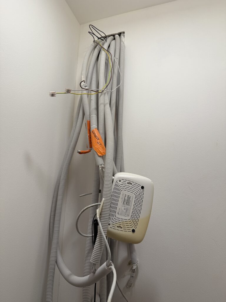 Instalace a zapojení sítě v rodinném domě po rekonstrukci. V technické místnosti vytahané husí krky s nataženou kabeláží do připravených neosazených zásuvek a přívod internetu ze sklepa, kde byl umístěn modem od Vodafone.