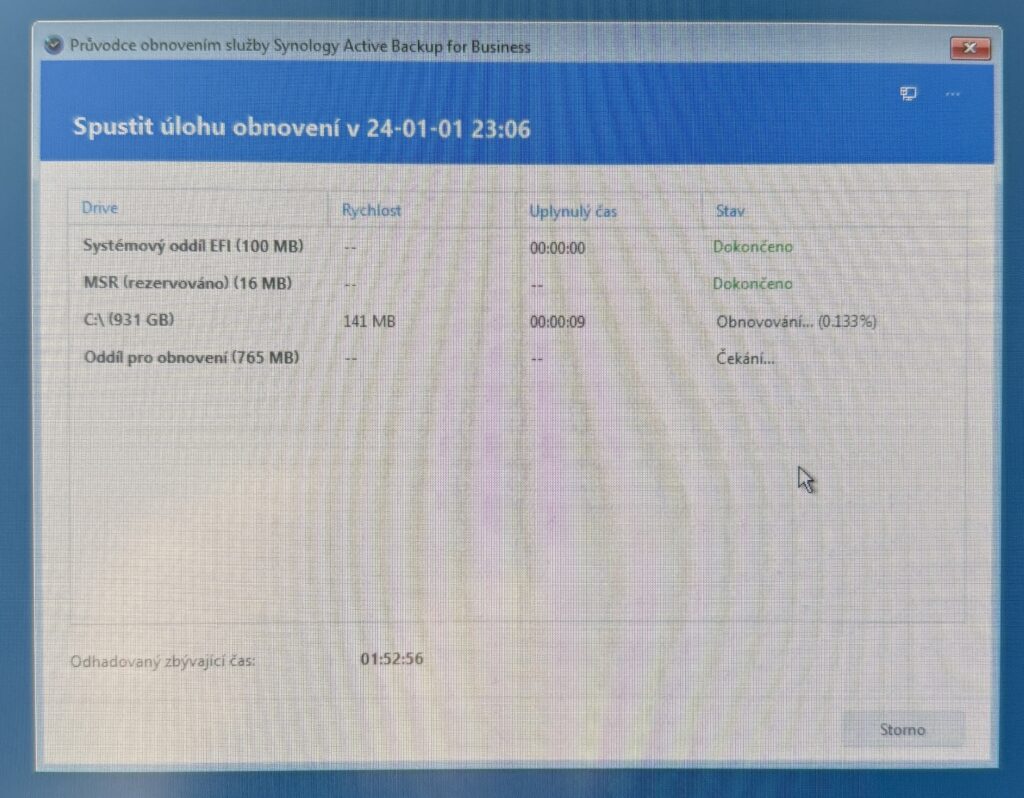 Jelikož se jednalo o totožné konfigurace, zvolil jsem instalaci jednoho počítače do finální podoby a druhý byl nainstalován pomocí zálohy Synology Active Backup for Business z mého osobního NAS serveru Synology DS920+.